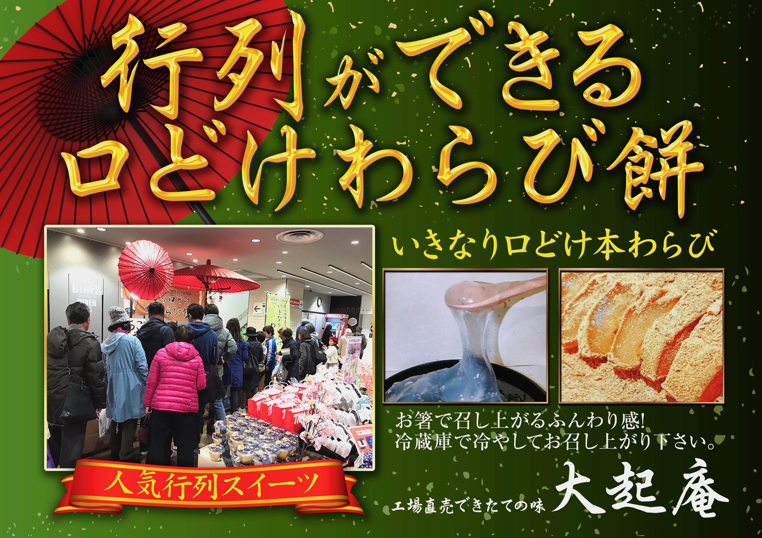 行列の出来る『口どけ本わらび餅』は、大起庵の1番の爆売れ商品です。 お子様からお年を召した方まで老若男女問わずお召し上がり頂けます。 是非、大起庵の『口どけ本わらび餅』をご賞味ください。