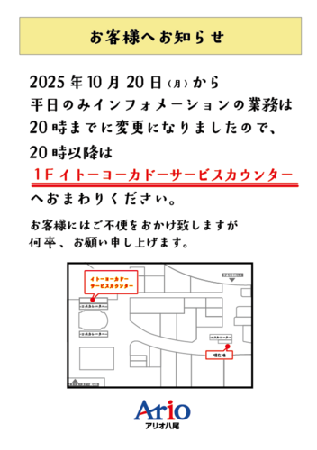2025年10月20日(月)から平日のみインフォメーションの業務は20時までに変更になりましたので、