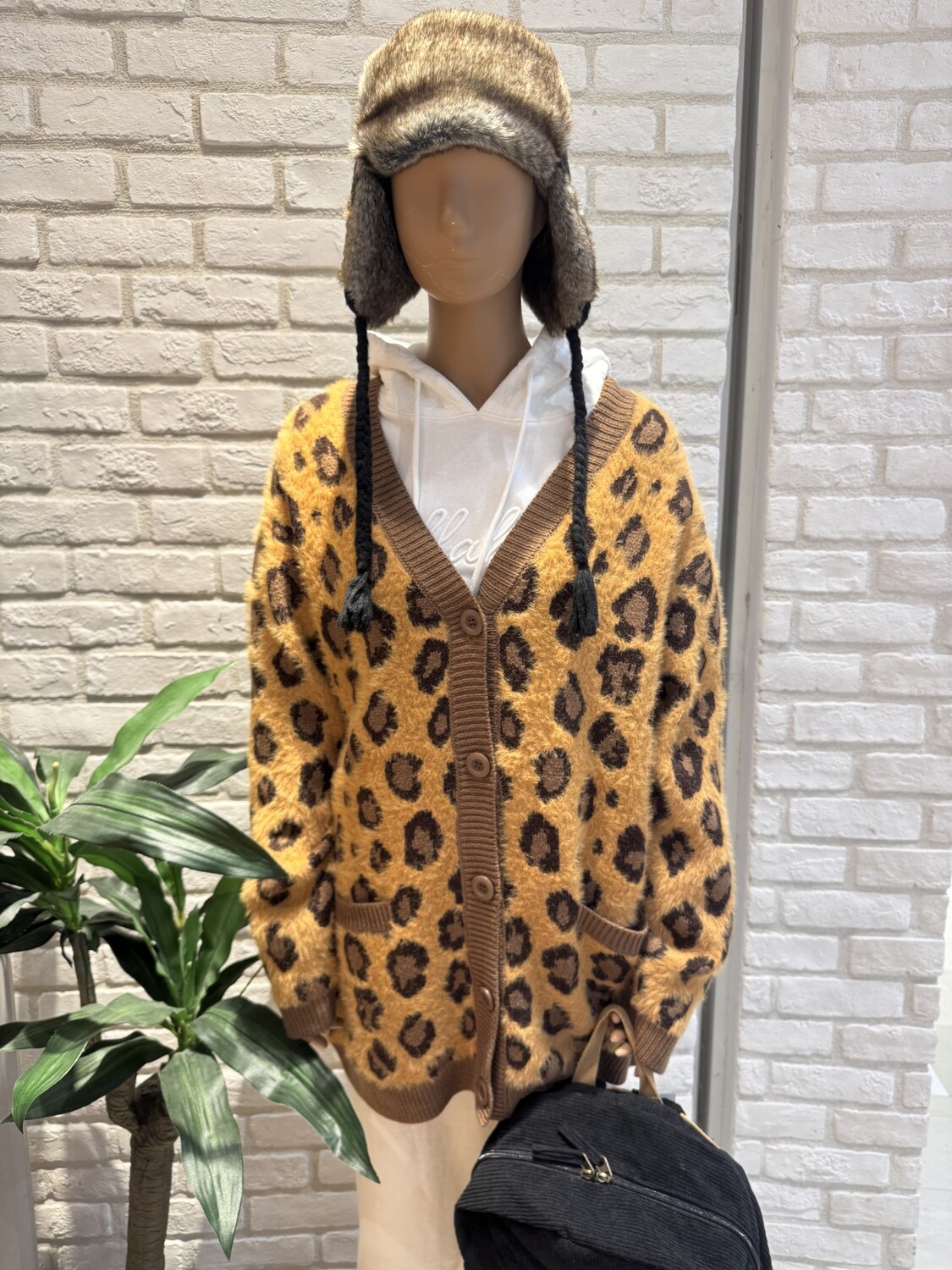 モヘア調のベースにアクリル糸でレオパード柄を表現したジャガードカーデセーター。トレンド感のあるデザインのVネックカーディガン。少し長めの着丈でルーズフィットなオーバーサイズ。たっぷりとしたシルエットで着こなせます。バックにはパイル状のサガラ刺繍を、胸元には刺繍をあしらいました。少し太めのリブをアクセントにしました。フロントポケット付き。