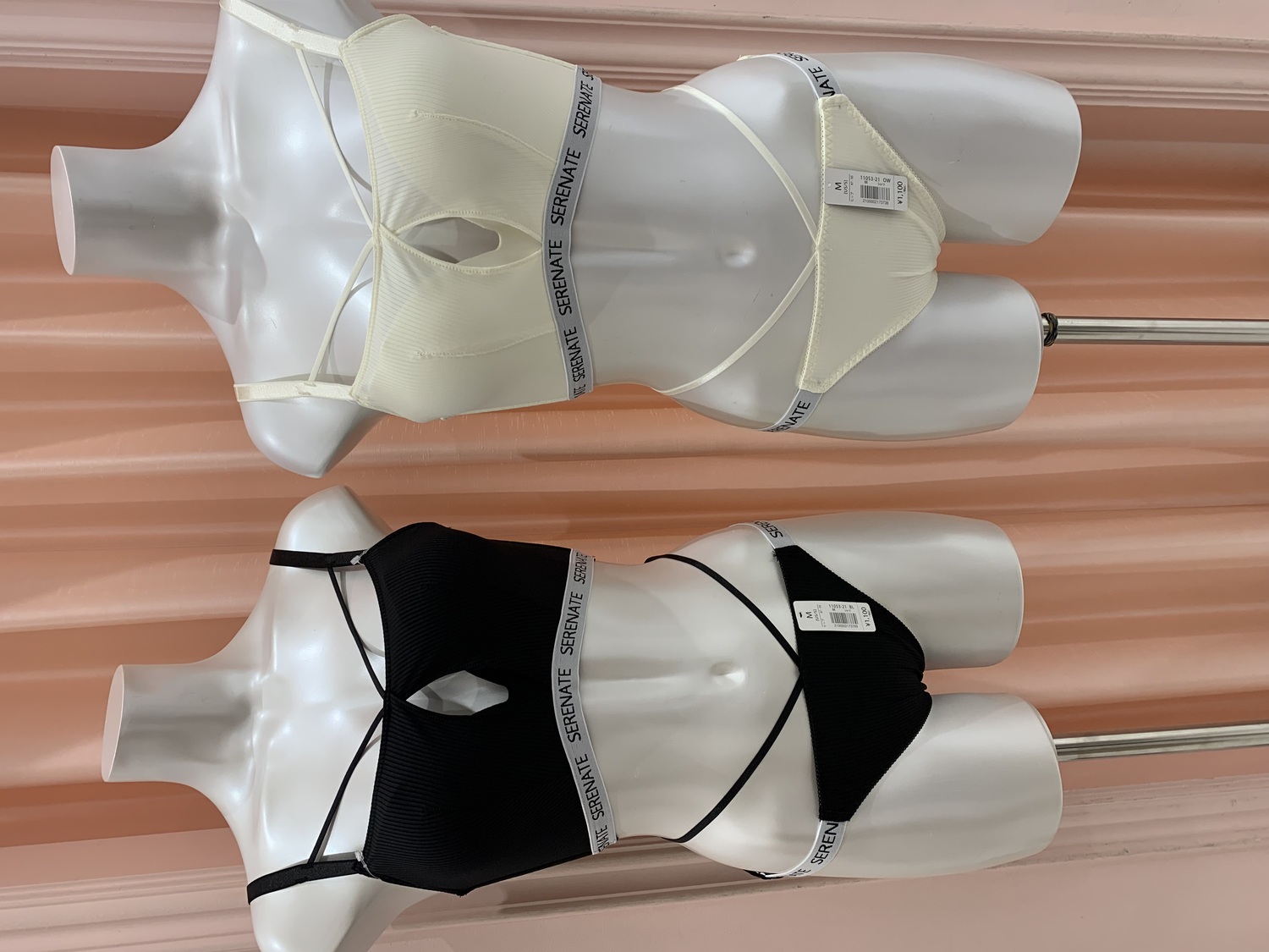 スポーティなロゴゴムでカジュアルデザインだけじゃなく、中央から覗く谷間とデコルテを飾るコードがセクシーでシンプルすぎないデザインが魅力です❤︎❤︎