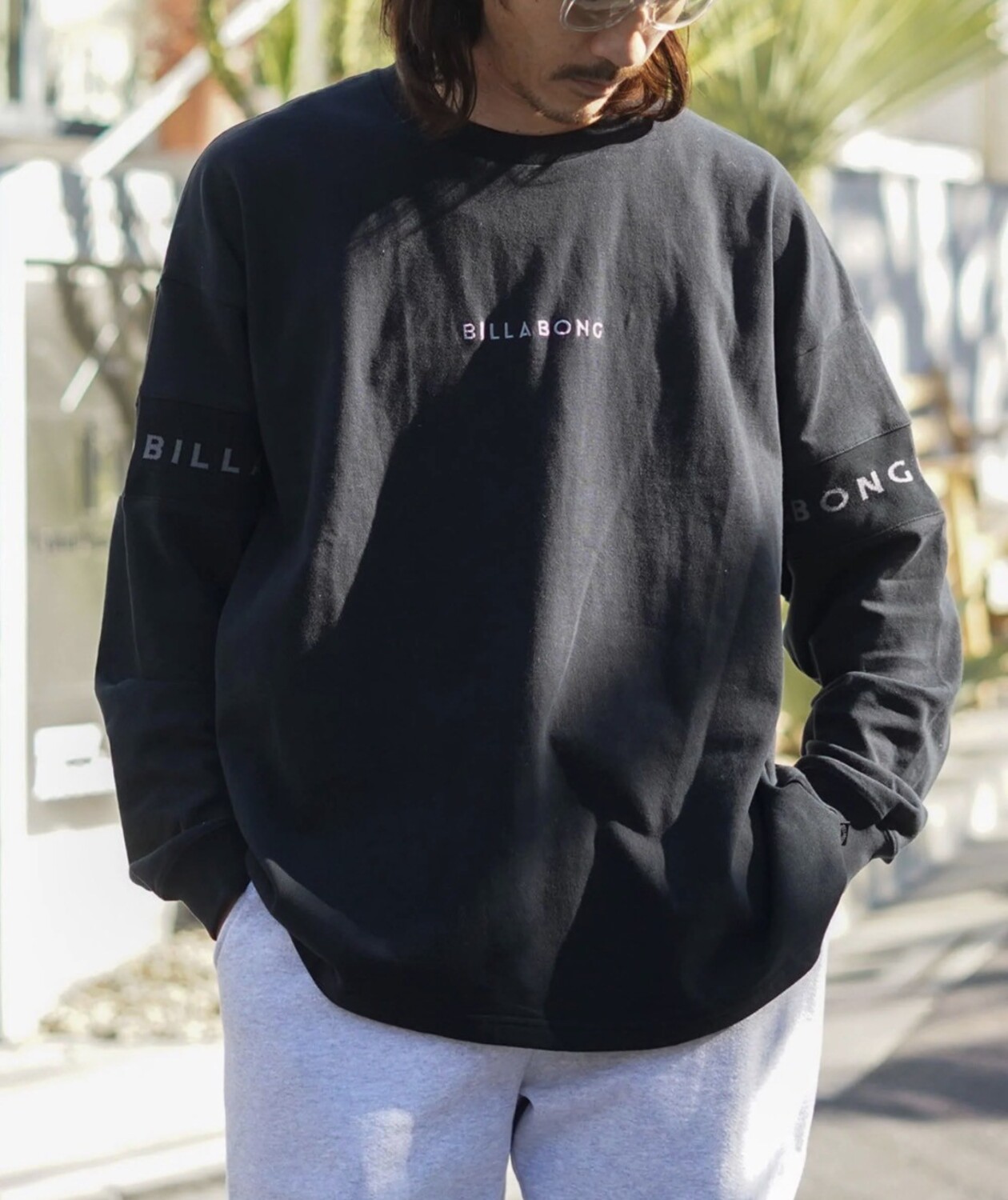 胸元にはシンプルなブランドロゴの刺繍を配置し、両袖にはBILLABONGのレタリングロゴがテープ状にデザインされています🌟