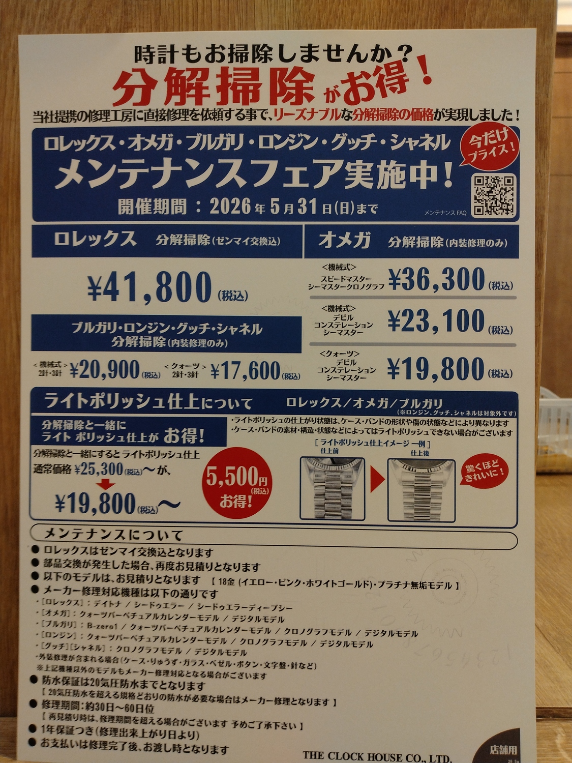 只今アイクロックでは腕時計のメンテナンスフェアを実施中です