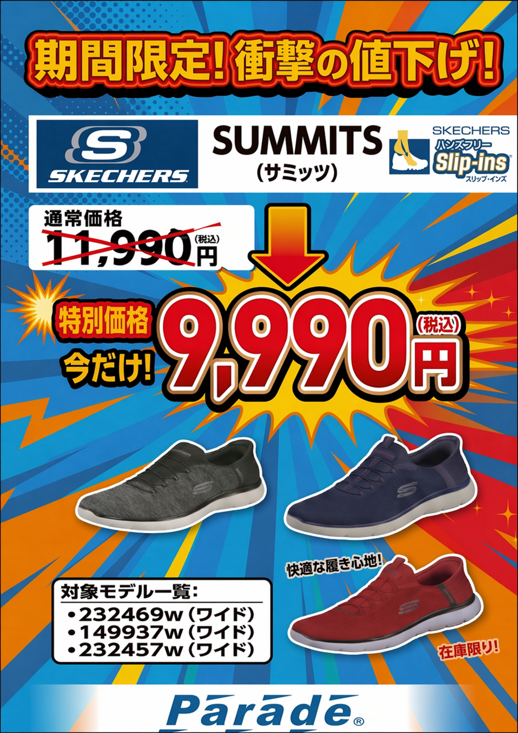 スケッチャーズでは、4月18日(土)から6月21日(日)までのロングラン企画として、不動の人気を誇る**「SUMMITS(サミッツ)」のワイドモデルを、通常価格11,990円のところ期間限定・特別価格9,990円(税込)**にてご提供いたします!
